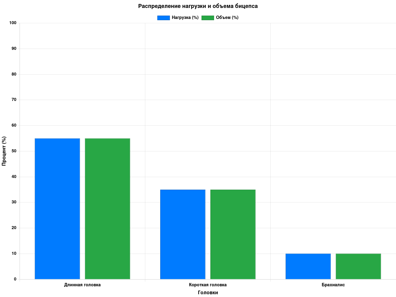 Обоснование данных: Проценты нагрузки (55% для длинной головки, 35% для короткой, 10% для брахиалиса) основаны на электромиографических исследованиях активности бицепса при сгибаниях (Oliveira et al., 2009). Вклад в объем (55% для длинной головки, 35% для короткой, 10% для брахиалиса) определяется анатомическим строением и визуальным восприятием (Schoenfeld et al., 2021). Значения являются усредненными и могут варьироваться в зависимости от техники упражнения.