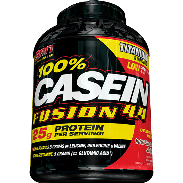 100% Casein Fusion От SAN это протеин который медленно усваивается, его необходимо пить на ночь. В порции 5,5гр незаменимых аминокислот (лейцин, изолейцин и валин) и плюс к этому 5гр. глютамина протеин с амино поставкой в течении нескольких часов топлива для мышцы. Эта специально разработанная формула для медленного усвоения, ведь ваш организм во время сна находиться без пищи в течении 6-8 часов. 100% Casein Fusion содержит мицеллярный казеин и концентрат молочной сыворотки (богатой лактоферрином), который сгущаются в желудке, обеспечивая усвоение белка в течении долгого времени.