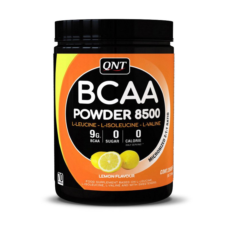 Продукт QNT BCAA Powder 8500 содержит комплекс BCAA 2:1:1 (L-Leucine, L-Isoleucine, L-Valine) и предназначен для приема с целью получения антикатаболического эффекта, а также, быстрого восстановления мышц после физических нагрузок. Добавка обладает очень быстрыми свойствами усвоения и потому наиболее актуально делать прием BCAA Powder 8500 перед и в процессе тренировки.